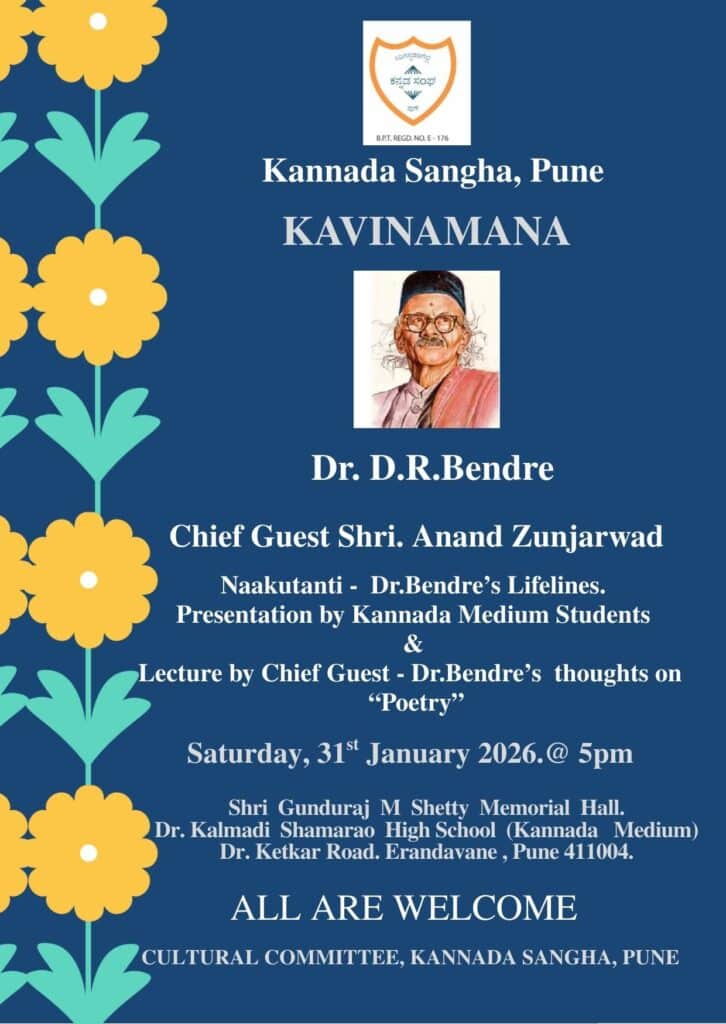 SamacharKannada Sangha, Pune is organizing KAVINAMANA, a respectful tribute to the renowned Kannada poet Dr. D. R. Bendre. The program includes Naakutanti—Dr. Bendre’s lifelines—presented by Kannada medium students, followed by a lecture by Chief Guest Shri Anand Zunjarwad on Dr. Bendre’s thoughts on poetry. The event will be held on Saturday, 31st January 2026 at 5:00 PM at Shri Gunduraj M. Shetty Memorial Hall, Pune. All are warmly welcome to attend.