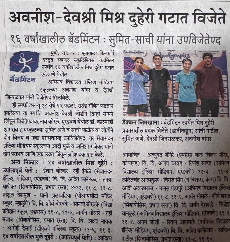 Sumit Anne and Sachi Patil both from grade 9 won Silver medal in Mixed doubles Sakal Schoolympics badminton tournament.